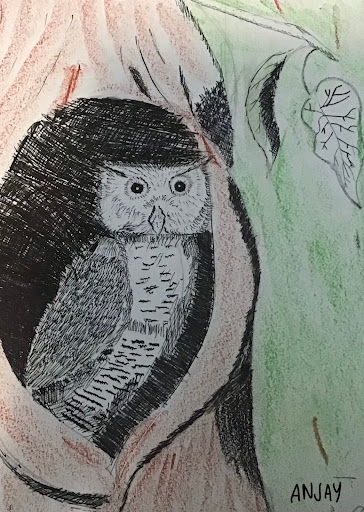 Description: One of the fiercest animals there is, this owl was made by a combination of oil pastel, pens, and dahsing fearlessness. Sitting perched atop a tree, it overlooks the grass as it scavenges for food to eat.